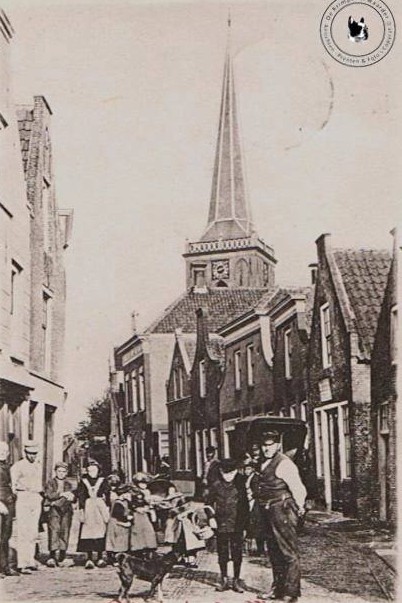 Een foto van de Dorpsstraat te Ouderkerk aan den IJssel in het begin van de 20e eeuw. Ergens aan de linkerkant, achter de huizen moet de woning van de familie Walg hebben gestaan,