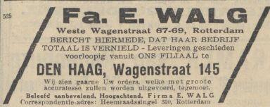 Na die tragische dag in mei 1940 wordt het gezin in eerste instantie opgevangen door broer Andries, maar al snel vindt in ieder geval Jacob onderdak bij zijn nicht Saartje Bär-Walg en haar gezin aan de Heemraadsingel 310. Vanuit dat adres probeert hij ook zijn bedrijf te herstarten. Nog geen maand na het noodlottige bombardement wordt de bedrijfsactiviteit verplaatst naar de vestiging in Den Haag. Een verhuizing van de zaak, die waarschijnlijk al op de planning stond gaat gewoon door. Voortaan opereert de Firma E.Walg vanuit de Wagenstraat no. 125a in Den Haag.