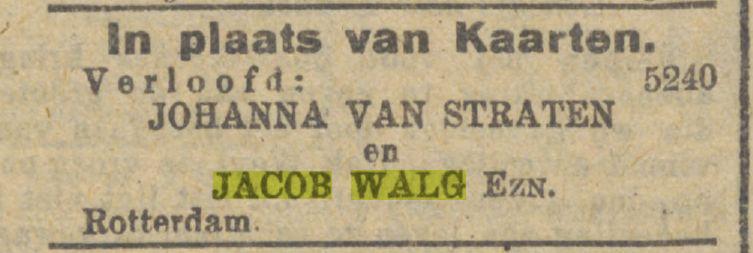 Op 28 januari 1916 verschijnt in het Rotterdamsch Dagblad een verlovingsadvertentie van Jacob Walg en Johanna van Straten. Deze huwelijksbelofte wordt echter niet ingelost, want vier jaar later, op 6 februari 1918, trouwt Jacob in Rotterdam met de negentien jaar jongere Catharina Walg (roepnaam Cato).